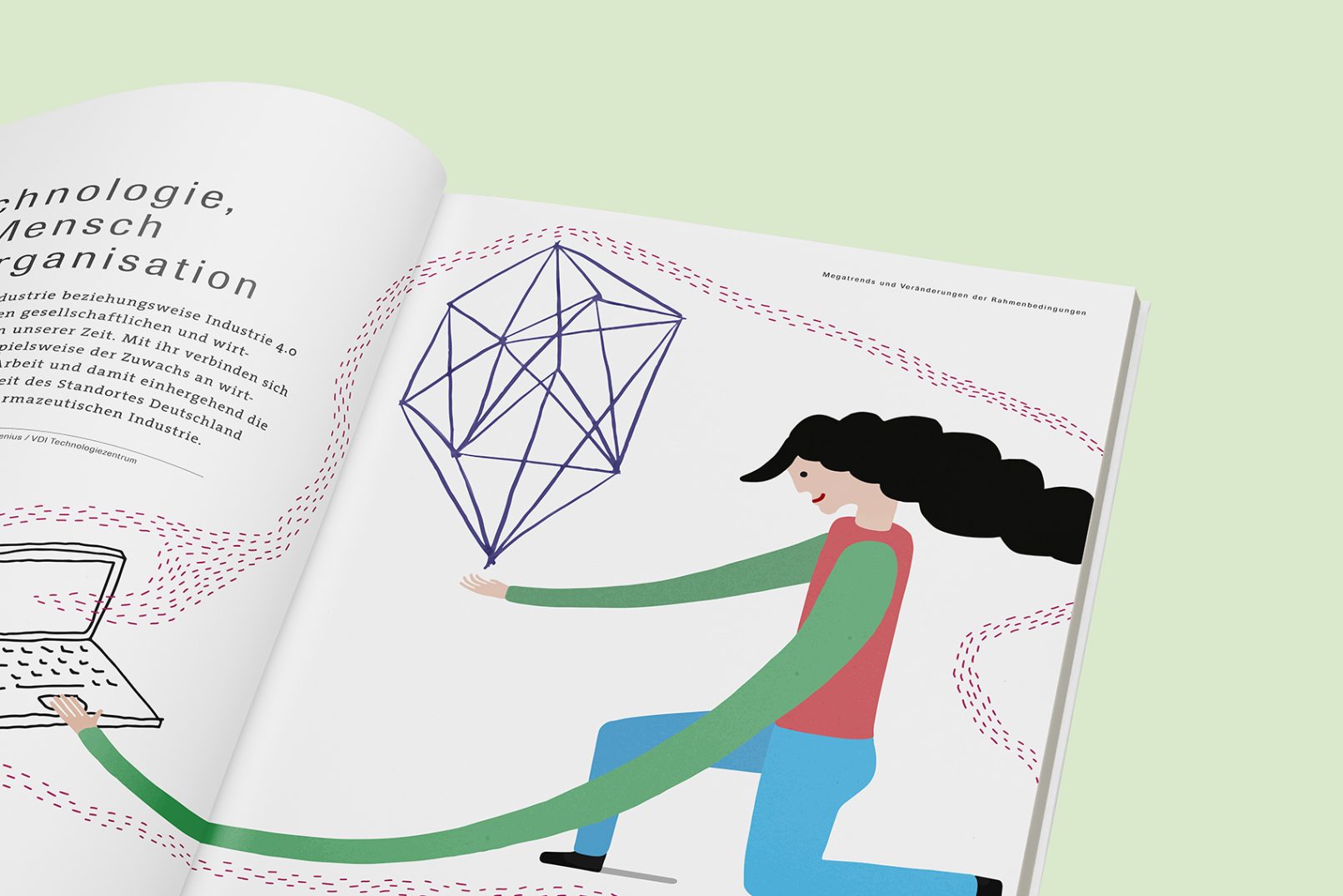 Ausgehend von redigierten Artikeln verschiedenster Experten aus der Chemie- und Pharmabranche betreuten wir den gesamten Entstehungsprozess bis zum fertig gedruckten Magazin. Die Covergestaltung einhergehend mit dem Keyvisual für die Veranstaltung war natürlich das Sahnestück des Projektes. Des Weiteren beinhaltete das Magazin die Erstellung eines abwechslungsreichen Seitenplans, die Gestaltung der anspruchsvollen Artikel, das Managen von unterschiedlichen Illustratoren und Designern, der enge Austausch mit dem Kunden, die Druckabnahme direkt vor Ort. Des Weiteren wurde einzelne Artikel in das Digital Magazin übertragen. Diese vielfältige Art Direction und Kundenbetreuung empfand ich als besonders ansprechend und bereichernd.